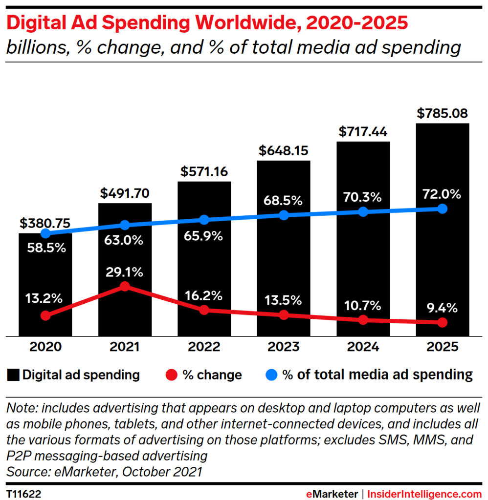 Digital marketing spend makes up 63% of all global advertising spend and is forecast to grow to 72% by 2025. Although ad costs are likely to increase in the coming years, there will still be more clicks, bids, and ad listings. Similarly, with the growth of more data-intensive ad formats like programmatic video and connected tv (CTV) in the coming years, the overall carbon impact of these digital ad dollars is likely to increase.